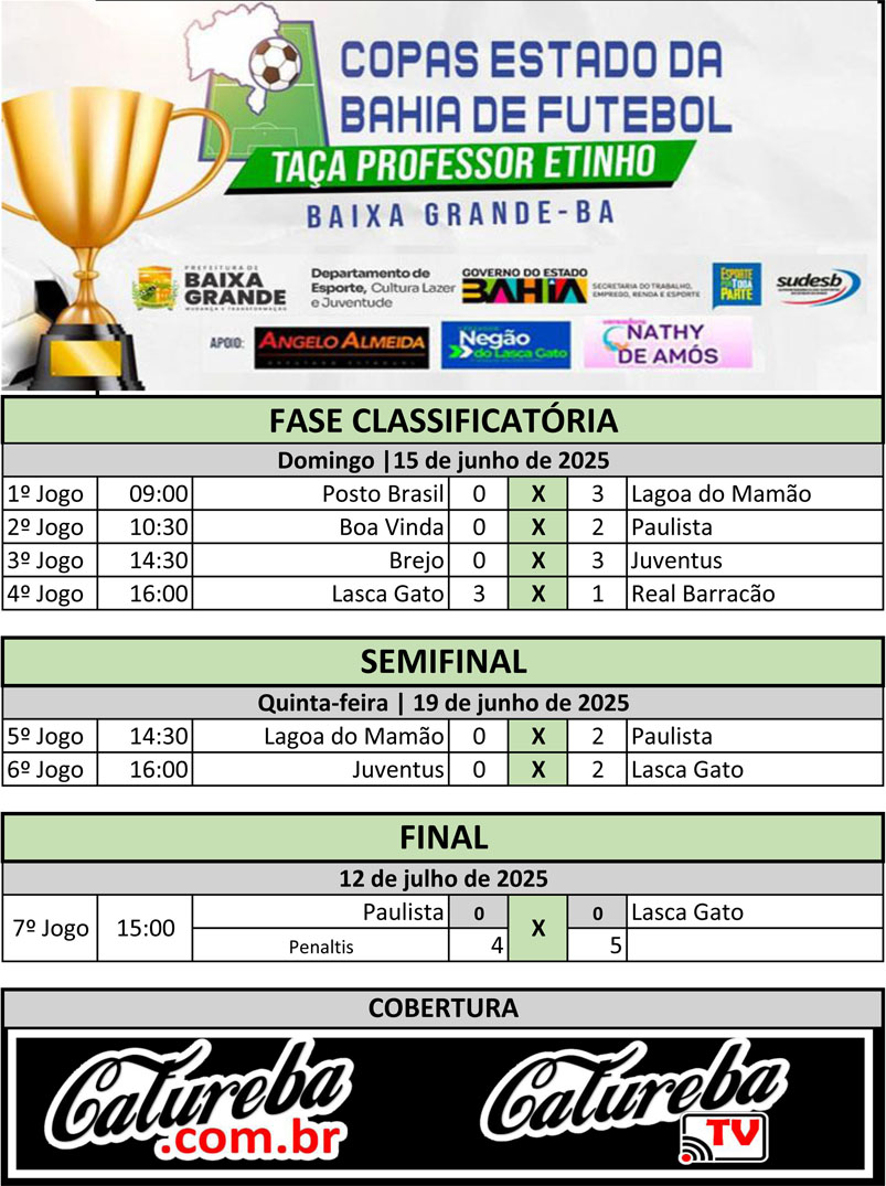 Tabela da Copa do Estado da Bahia 2025 em Baixa Grande Posted on 21 de julho de 2025 By Ediomario Biblioteca