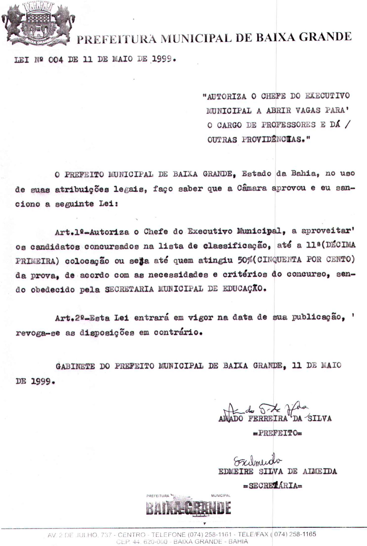Lei 004/1999 | Autoriza o Executivo abrir vagas para cargos de Professores para quem atingiu até 50% da prova Posted on 11 de maio de 199927 de setembro de 2022 By ediomario Arquivo cedido por João Gouberto Sem categoria