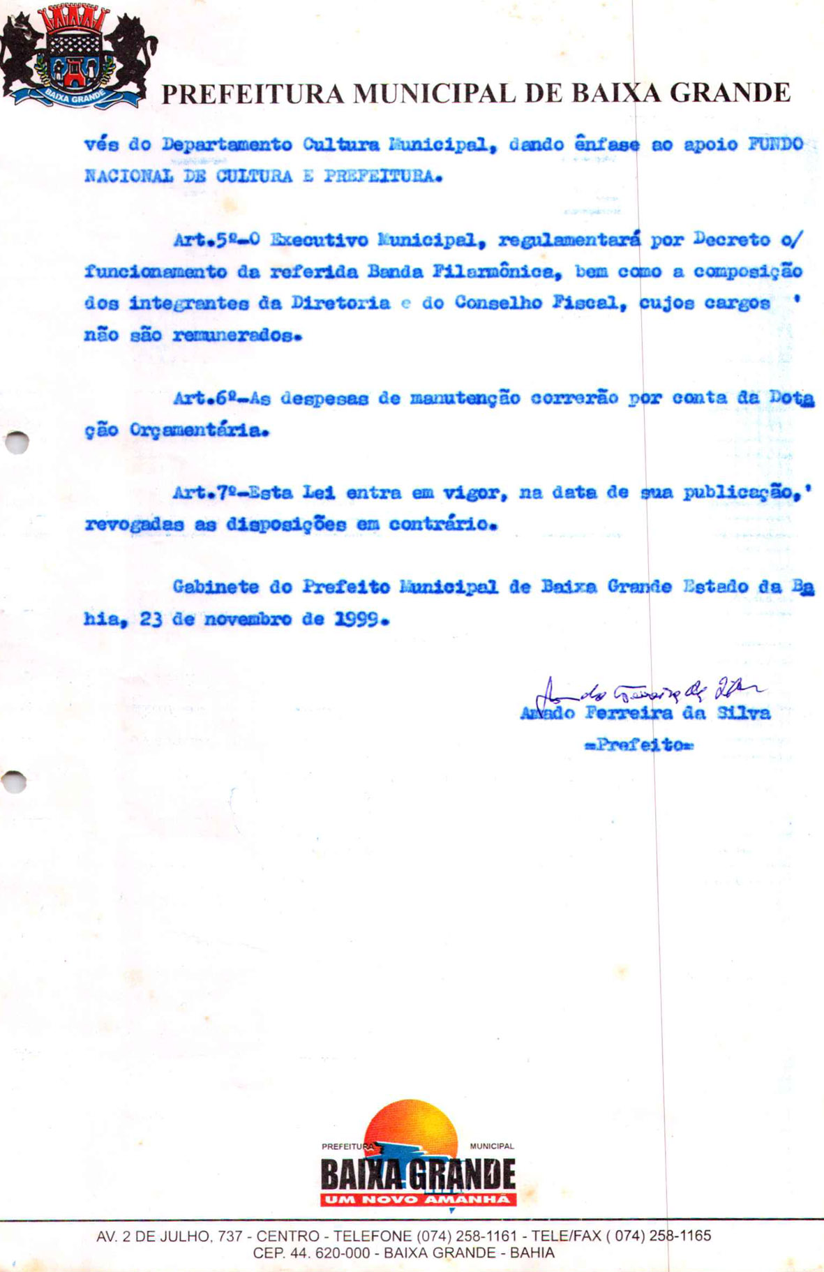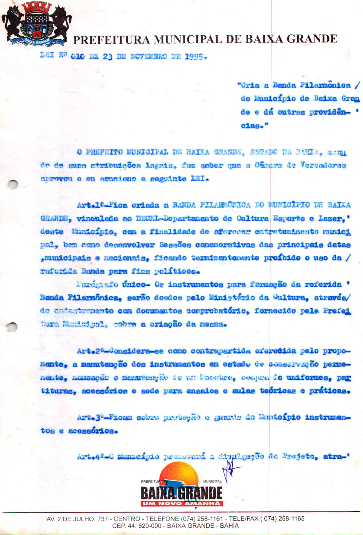 Lei 010/1999 | Cria a Banda Filarmônica do Município de Baixa Grande vinculado ao DECEL Posted on 23 de novembro de 199927 de setembro de 2022 By ediomario Arquivo cedido por João Gouberto Sem categoria