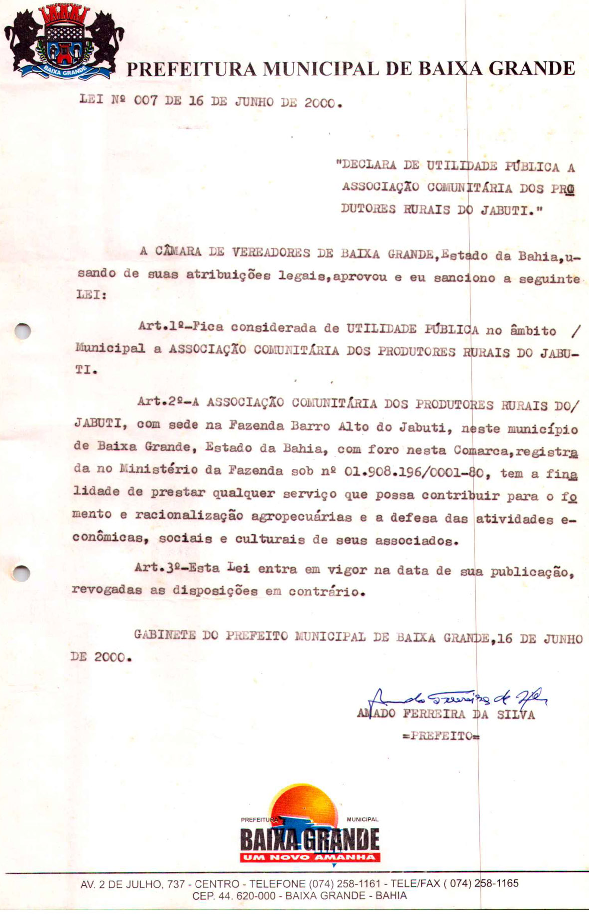Lei 007/2000 | Declara de Utilidade Pública a Associação Comunitária dos Produtores Rurais do Jabuti