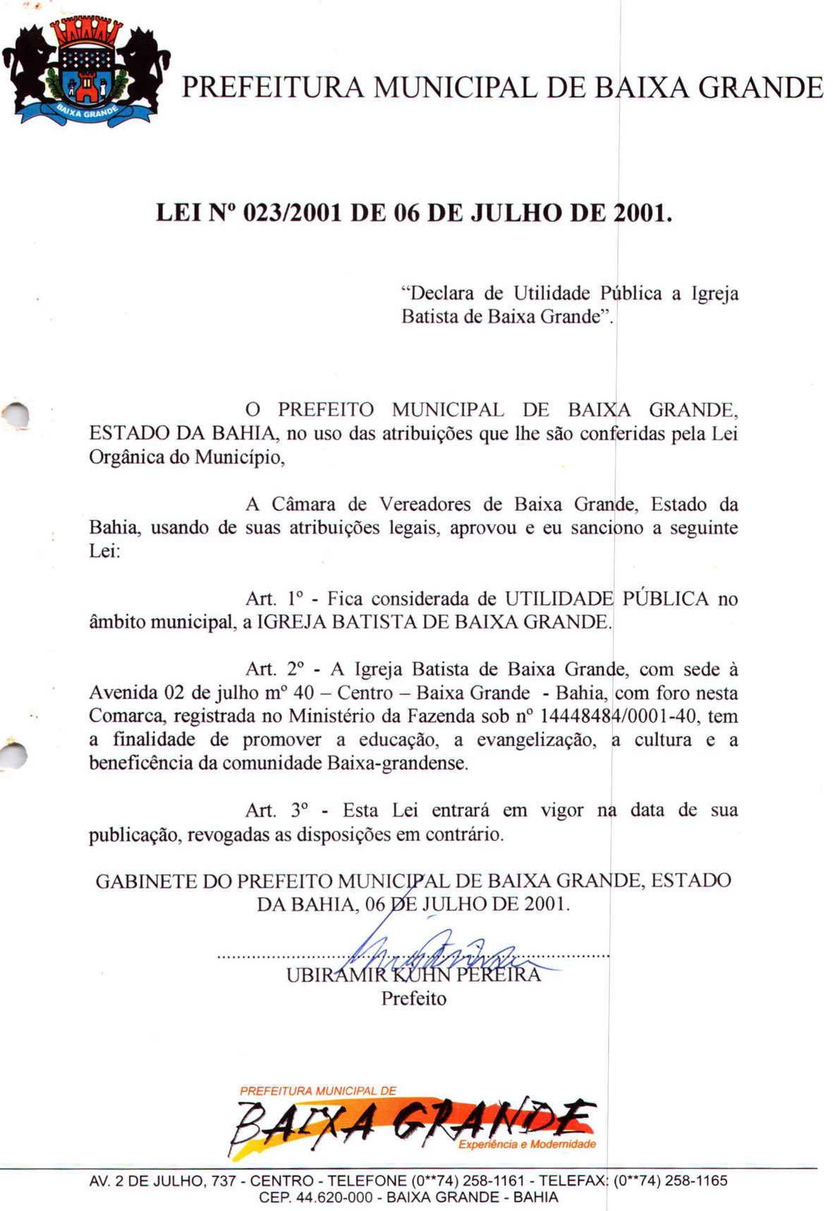 Lei 023/2001 | Declara de Utilidade Pública a Igreja Batista de Baixa Grande Posted on 6 de julho de 200130 de setembro de 2022 By ediomario Arquivo cedido por João Gouberto Sem categoria