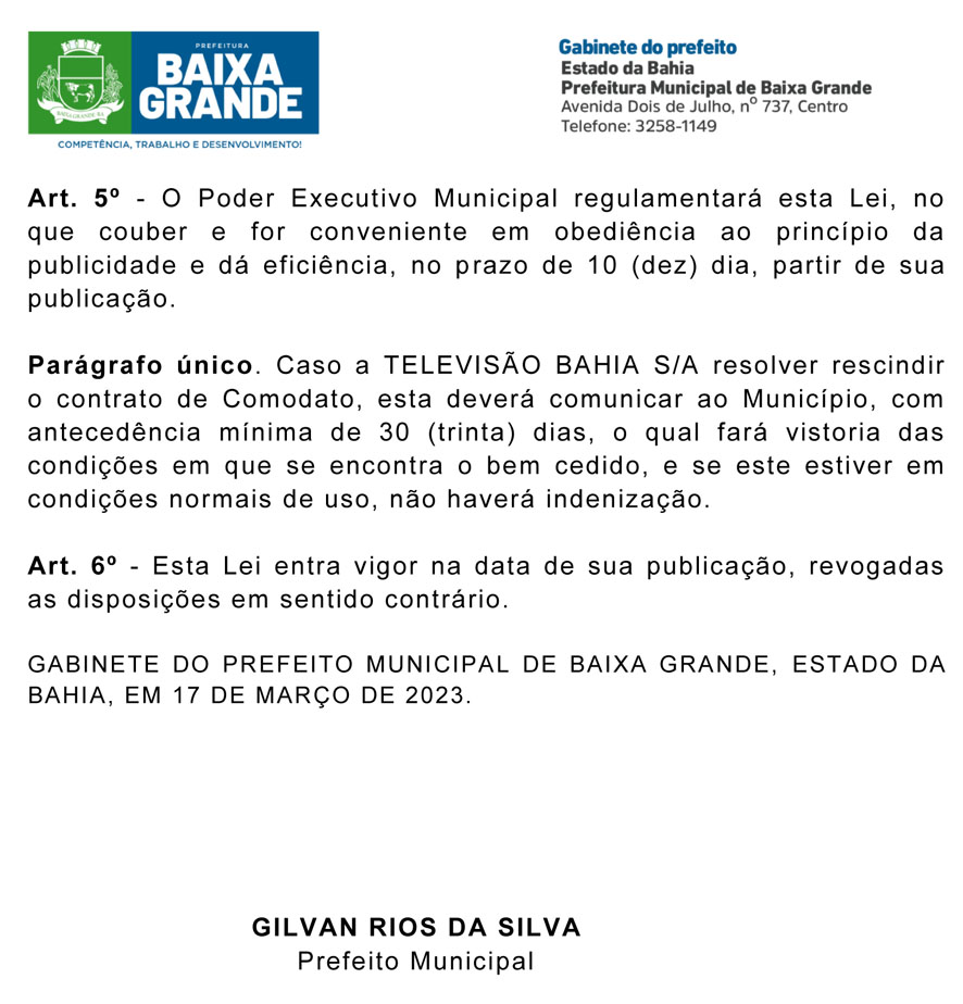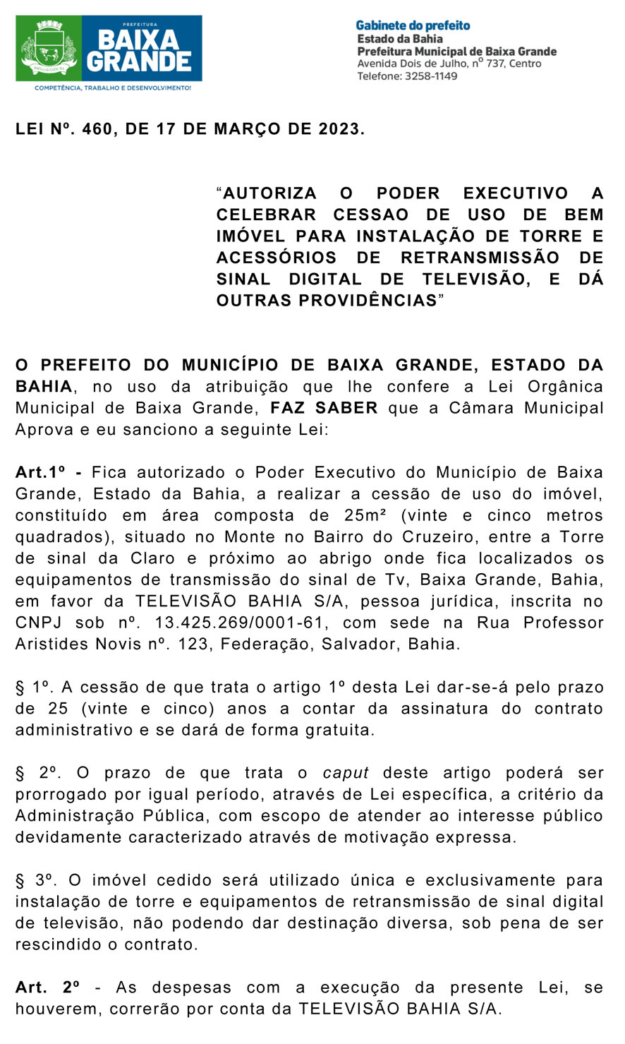 Lei 460/2023 | Autoriza o Poder Executivo a celebrar cessão de Uso de Bem Imóvel para Instalação de Torre de TV Digital – Televisão Bahia S/A Posted on 17 de março de 20233 de maio de 2023 By ediomario Arquivo cedido por João Gouberto Sem categoria
